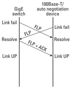 In the first case, both devices begin in a link fail state. (See Figure 1.) The GigE switch begins sending Fast Link Pulses. The old 10Base-T device begins sending NLPs. When the GigE switch receives the NLPs, it immediately hands off negotiation to a legacy 10Base-T Physical Medium Attachment module.