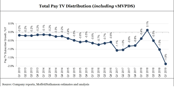 The combined losses from cable, satellite and Telco TV equaled 1.4 million subscribers, 75% worse than over the same period in 2018. It was also the largest rate of decline in terms of percentages at -4.8%.